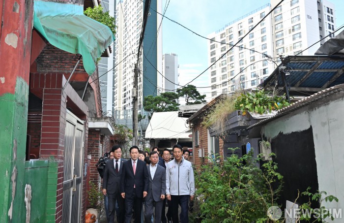 [서울=뉴스핌] 양윤모 기자 = 오세훈 서울시장이 24일 오전 장동혁 국민의힘 당대표,송언석 원내대표와 조합장 과 함께 노원구 상계5 재정비촉진구역 현장을 방문해 점검을 하고 있다. 서울 노원구 상계동 109-43번지의 상계5구역은 재개발을 통해 지하 3층~지상 39층 14개동, 2016가구 및 부대복리시설로 조성된다. [공동취재] 2025.10.24 yym58@newspim.com