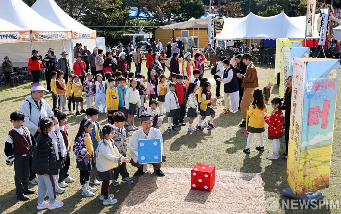 [서울=뉴스핌] 양윤모 기자 =24일 오후 경기도 이천시 이천농업테마공원에서 열린 '제24회 이천쌀문화축제'를 찾은 어린이들이 쌀놀이터에 마련된 민속놀이를 하고 있다. '맛과 멋이 어우러진, 쌀로 잇는 즐거움'이란 주제로 열리는 올해 축제는 다양한 참여 및 체험 행사와 전통 공연 등으로 26일까지 열린다. [사진=이천시청] 2025.10.24 yym58@newspim.com