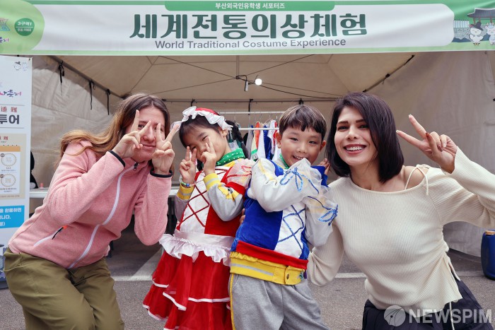 [서울=뉴스핌] 양윤모 기자 = 24일 오후 부산시 동래구(구청장 장준용)가 주최한 '제31회동래읍성역사축제'를 찾은 어린이들이 세계전통의상 체험을 하고 있다. ‘동래성 사람들, 역사와 미래를 잇다’라는 새로운 슬로건으로 열리는 올해 축제는 동래성 항전 이야기에 4차 산업 기술을 접목한 새로운 체험과 공연으로 오는 26일까지 동래문화회관, 동래읍성광장, 명륜1번가, 온천천카페거리, 온천장, 청소년센터, 혁신어울림센터 일원에서 진행된다. [사진=동래구청] 2025.10.24 yym58@newspim.com