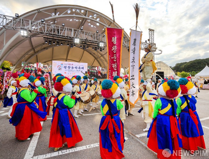 [서울=뉴스핌] 양윤모 기자 = 24일 오후 강원도 평창군 용평면 평창농악축제장 일원에서 열린 '2025평창농악축제' 개막 축하 공연으로 둔전평농악이 펼쳐지고 있다. '흥겹게 울려펴지는 우리 소리! 신명나게 즐기는 평창의 가을'이란 주제로 열리는 올해 축제는 다양한 전통 농악 공연과 체험행사와 평창의 특색있는 먹거리로 26일까지 열린다. [사진=평창군청] 2025.10.25 yym58@newspim.com