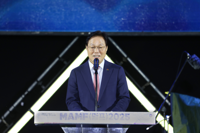 | 박완수 경남지사가 24일 저녁 창원 용지문화공원에서 열린 '제20회 문화다양성축제 맘프(MAMF*)' 개막식에서 축사하고 있다. [사진=경남도] 2025.10.25 |