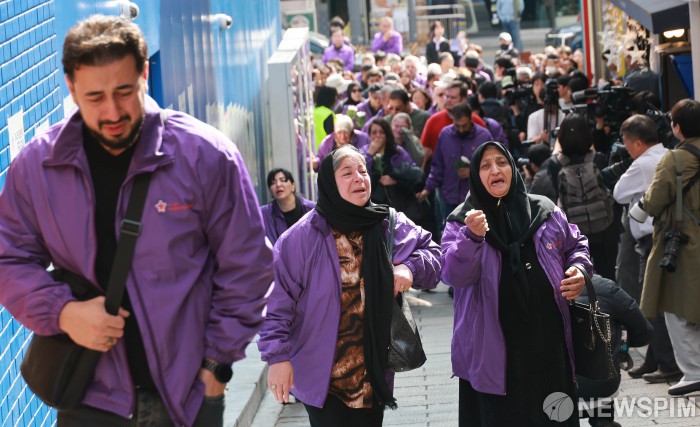 [서울=뉴스핌] 김학선 기자 = 10·29 이태원 참사 외국인 희생자 유가족들이 25일 서울 용산구 이태원역 1번 출구 앞 '10·29 기억과 안전의 길'을 찾아 참사 현장을 살펴보며 눈물을 흘리고 있다. 2025.10.25 yooksa@newspim.com