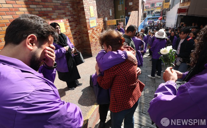 [서울=뉴스핌] 김학선 기자 = 10·29 이태원 참사 외국인 희생자 유가족들이 25일 서울 용산구 이태원역 1번 출구 앞 '10·29 기억과 안전의 길'을 찾아 참사 현장을 살펴보며 눈물을 흘리고 있다. 2025.10.25 yooksa@newspim.com