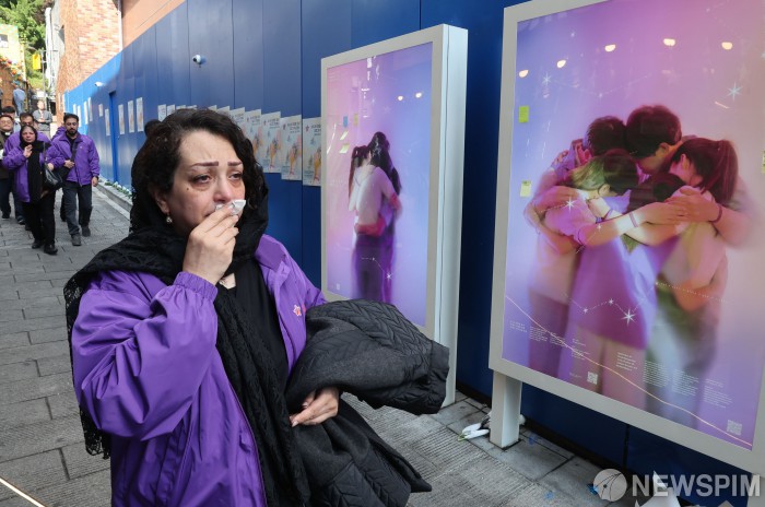 [서울=뉴스핌] 김학선 기자 = 10·29 이태원 참사 외국인 희생자 유가족들이 25일 서울 용산구 이태원역 1번 출구 앞 '10·29 기억과 안전의 길'을 찾아 참사 현장을 살펴보며 눈물을 흘리고 있다. 2025.10.25 yooksa@newspim.com