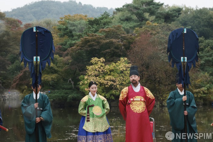 [서울=뉴스핌] 이길동 기자 =26일 오전 서울 종로구 창경궁에서 펼쳐진 조선 후기 정조시대 왕가의 행렬인 왕가의 산책에서 왕과 왕비가 시민들과 관광객들을 만나고 있다. 국가유산청 궁능유적본부와 국가유산진흥원은 24일부터 26일까지 서울 창경궁에서 전통 명절 '중양절(重陽節)'을 주제로 한 '궁궐 일상 모습 재현 및 체험'을 개최했다.2025.10.26 gdlee@newspim.com