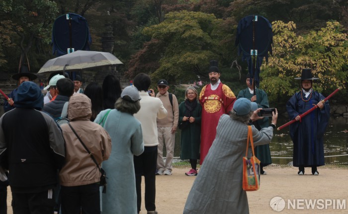 [서울=뉴스핌] 이길동 기자 =26일 오전 서울 종로구 창경궁에서 펼쳐진 조선 후기 정조시대 왕가의 행렬인 왕가의 산책에서 왕과 왕비가 시민들과 관광객들을 만나고 있다. 국가유산청 궁능유적본부와 국가유산진흥원은 24일부터 26일까지 서울 창경궁에서 전통 명절 '중양절(重陽節)'을 주제로 한 '궁궐 일상 모습 재현 및 체험'을 개최했다.2025.10.26 gdlee@newspim.com
