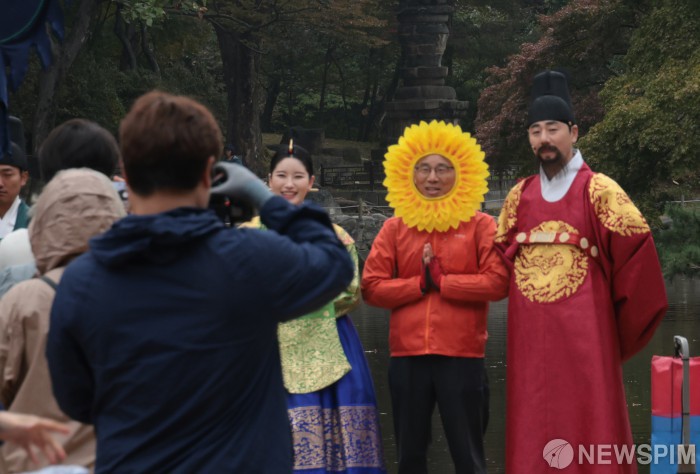 [서울=뉴스핌] 이길동 기자 =26일 오전 서울 종로구 창경궁에서 펼쳐진 조선 후기 정조시대 왕가의 행렬인 왕가의 산책에서 왕과 왕비가 시민들과 관광객들을 만나고 있다. 국가유산청 궁능유적본부와 국가유산진흥원은 24일부터 26일까지 서울 창경궁에서 전통 명절 '중양절(重陽節)'을 주제로 한 '궁궐 일상 모습 재현 및 체험'을 개최했다.2025.10.26 gdlee@newspim.com