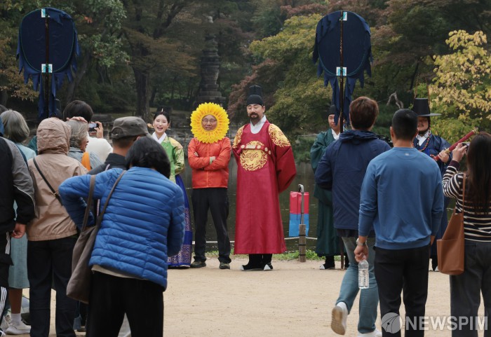 [서울=뉴스핌] 이길동 기자 =26일 오전 서울 종로구 창경궁에서 펼쳐진 조선 후기 정조시대 왕가의 행렬인 왕가의 산책에서 왕과 왕비가 시민들과 관광객들을 만나고 있다. 국가유산청 궁능유적본부와 국가유산진흥원은 24일부터 26일까지 서울 창경궁에서 전통 명절 '중양절(重陽節)'을 주제로 한 '궁궐 일상 모습 재현 및 체험'을 개최했다.2025.10.26 gdlee@newspim.com