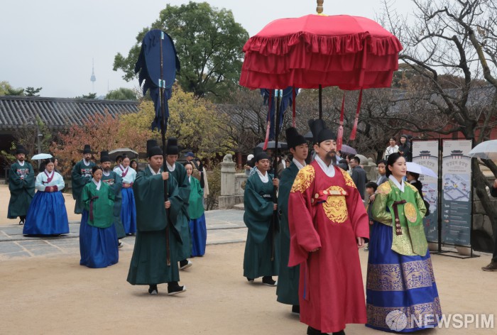 [서울=뉴스핌] 이길동 기자 = 시월의 마지막 휴일인 26일 오전 서울 종로구 창경궁에서 조선 후기 정조시대 왕가의 행렬인 왕가의 산책이 펼쳐지고 있다. 국가유산청 궁능유적본부와 국가유산진흥원은 24일부터 26일까지 서울 창경궁에서 전통 명절 '중양절(重陽節)'을 주제로 한 '궁궐 일상 모습 재현 및 체험'을 개최했다.2025.10.26 gdlee@newspim.com