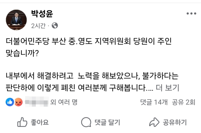 박 전 시의원은 26일 오후 페이스북에 적은 글을 통해 "지난 24일 열린 중·영도 지역위원회 상무위원회가 의결 정족수(35명 과반 참석)를 채우지 못했음에도 불구하고 지역위원장이 의사봉을 두드리며 안건을 통과시켰다"고 밝혔다.