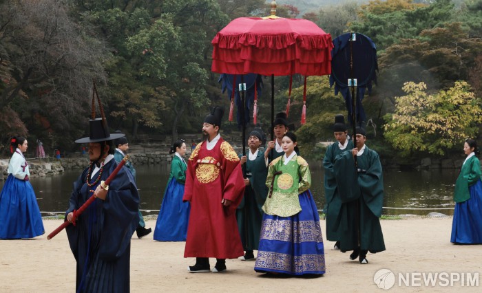 [서울=뉴스핌] 이길동 기자 = 시월의 마지막 휴일인 26일 오전 서울 종로구 창경궁에서 조선 후기 정조시대 왕가의 행렬인 왕가의 산책이 펼쳐지고 있다. 국가유산청 궁능유적본부와 국가유산진흥원은 24일부터 26일까지 서울 창경궁에서 전통 명절 '중양절(重陽節)'을 주제로 한 '궁궐 일상 모습 재현 및 체험'을 개최했다.2025.10.26 gdlee@newspim.com
