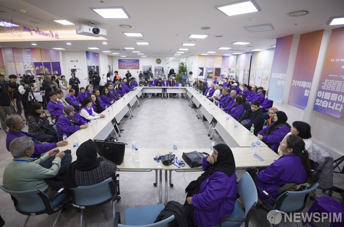 [서울=뉴스핌] 이길동 기자 =송해진 이태원참사 유가족협의회 운영위원장이 26일 오후 서울 종로구 10.29 이태원참사 기억소통공간인 별들의집에서 열린 외국인 희생자 유가족들과의 간담회에서 발언하고 있다.2025.10.26 gdlee@newspim.com