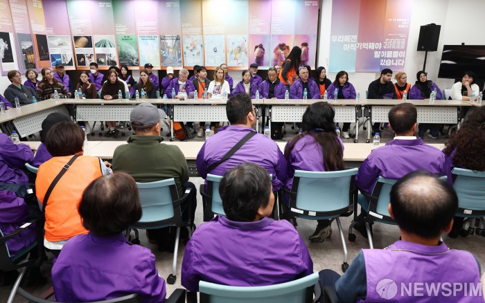 [서울=뉴스핌] 이길동 기자 = 26일 오후 서울 종로구 10.29 이태원참사 기억소통공간인 별들의집을 찾은 외국인 희생자 유가족들이 간담회를 하고 있다.2025.10.26 gdlee@newspim.com