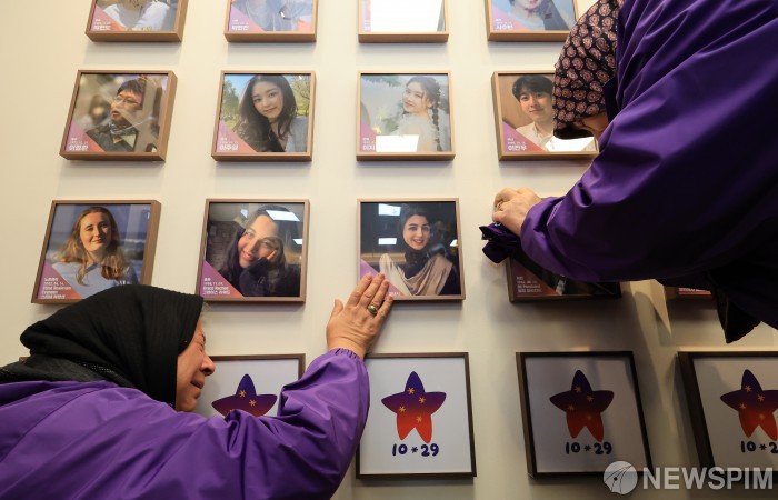 [서울=뉴스핌] 이길동 기자=26일 서울 종로구 별들의집에서 이태원 참사 희생자 외국인 유가족들이 고인의 사진을 어루만지고 있다.2025.10.26 gdlee@newspim.com