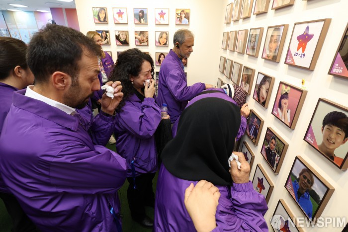 [서울=뉴스핌] 이길동 기자 =10·29 이태원참사 외국인 유가족이 26일 오후 서울 종로구 별들의 집에 방문해 희생자의 사진을 보며 눈물 흘리고 있다.2025.10.26 gdlee@newspim.com