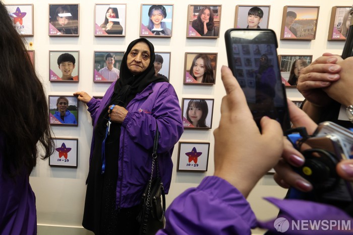 [서울=뉴스핌] 이길동 기자 =10·29 이태원참사 외국인 유가족이 26일 오후 서울 종로구 별들의 집에 방문해 희생자의 사진에 손을 얹고 사진을 찍고 있다.2025.10.26 gdlee@newspim.com