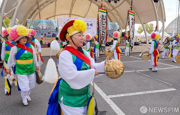 [서울=뉴스핌] 양윤모 기자 = 26일 오후 강원도 평창군 용평면 평창농악축제장 일원에서 열린 '2025평창농악축제'메인무대에서 함안 화천농악(경남무형유산) 공연이 펼쳐지고 있다. '흥겹게 울려펴지는 우리 소리! 신명나게 즐기는 평창의 가을'이란 주제로 열리는 올해 축제는 다양한 전통 농악 공연과 체험행사등 평창의 특색있는 먹거리로 열렸다. [사진=평창군청] 2025.10.26 yym58@newspim.com