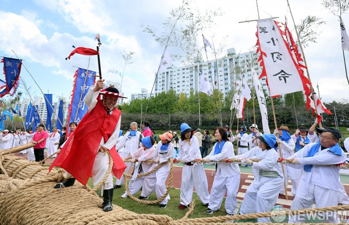 [서울=뉴스핌] 양윤모 기자 = 26일 오후 부산시 동래구(구청장 장준용)가 주최한 '제31회동래읍성역사축제' 의 대표행사인 세가닥 줄다리기 행사 온천천 카페거리에서 펼쳐지고 있다. ‘동래성 사람들, 역사와 미래를 잇다’라는 새로운 슬로건으로 열리는 올해 축제는 동래성 항전 이야기에 4차 산업 기술을 접목한 새로운 체험과 공연으로 열렸다. [사진=동래구청] 2025.10.26 yym58@newspim.com