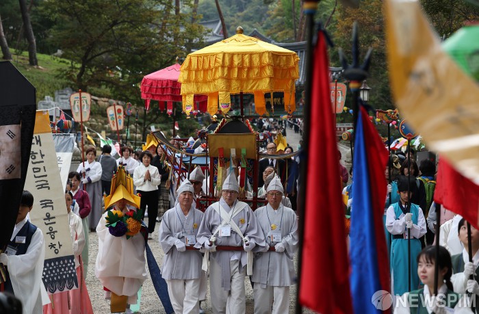 [서울=뉴스핌] 광복 80주년을 맞아 대한불교조계종 진관사는 지난 25일 수륙재 개건 627주년 기념 ‘2025년 진관사 수륙재’ 회향식을 봉행했다. 수륙재는 지난 7일부터 49일간 ‘광복 80년, 온 세상을 비추는 감사의 기도로’라는 주제로 진행됐다. 스님, 신도 등이 시련 행렬을 이어가고 있다. [사진=진관사] 2025.10.26 photo@newspim.com