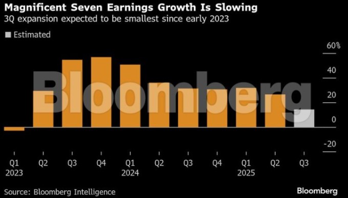 블룸버그 인텔리전스가 집계한 데이터에 따르면, 매그니피센트 세븐은 3분기에 14%의 이익 성장률을 기록할 것으로 예상되는데, 이는 2분기의 27%에서 하락한 수치다. 이는 S&P 500 전체의 예상 이익 성장률 8%의 거의 두 배에 달하지만, 2023년 1분기 이후 이 그룹의 가장 느린 속도이기도 하다.