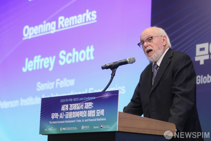 [서울=뉴스핌] 제프리 쇼트 PIIE 선임연구위원이 27일 FKI타워 컨퍼런스센터에서 열린 '2025 FKI-PIIE-OECD 국제 컨퍼런스'에 참석해 인사말을 하고 있다. '세계 경제질서 재편: 무역, AI, 금융회복력의 해법 모색'을 주제로 열리는 이번 컨퍼런스는 국가 간 전략경쟁 심화, 보호주의 확산, 공급망 재편, 금융시장 불안정 등 구조적 복합위기 상황 속에서 한국 경제가 나아갈 방향을 모색하기 위해 마련됐다. [사진=한경협] 2025.10.27 photo@newspim.com