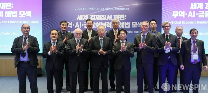 [서울=뉴스핌] 류진 한경협 회장(앞줄 왼쪽 네번째)을 비롯한 내빈들이 27일 FKI타워 컨퍼런스센터에서 열린 '2025 FKI-PIIE-OECD 국제 컨퍼런스'에 참석해 기념촬영을 하고 있다. '세계 경제질서 재편: 무역, AI, 금융회복력의 해법 모색'을 주제로 열리는 이번 컨퍼런스는 국가 간 전략경쟁 심화, 보호주의 확산, 공급망 재편, 금융시장 불안정 등 구조적 복합위기 상황 속에서 한국 경제가 나아갈 방향을 모색하기 위해 마련됐다. [사진=한경협] 2025.10.27 photo@newspim.com