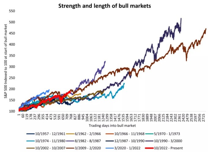 과거 S&P500 강세장별 지속 기간(X축, 일수)과 강도(Y축, 100에서 시작) 비교 [자료=에드워드존스]