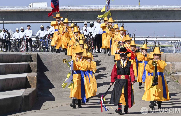 [서울=뉴스핌] 청사사진기자단 =27일 서울 여의도 한강공원 물빛무대에서 열린 자전거 신(新)조선통신사 행사에서 취타대의 연주와 함께 통신사 대원들이 입장하고 있다. 2025.10.27 photo@newspim.com