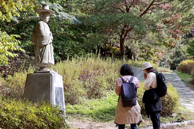 | 조령산 연풍선비길 선비상 앞에서 학부모들이 자녀의 수능 대박을 기원하고 있다. [사진=괴산군] 2025.10.27 baek3413@newspim.com |