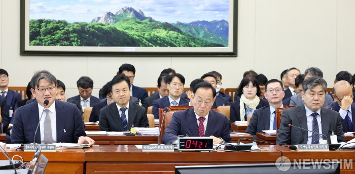 [서울=뉴스핌] 정일구 기자 = 권기섭 경제사회노동위원회(경사노위) 위원장, 김태기 중앙노동위원회 위원장, 이인재 최저임금위원회 위원장이 27일 서울 여의도 국회 기후에너지환경노동위원회에서 열린 경제사회노동위원회 등에 대한 국정감사에서 출석해 있다. 2025.10.27 mironj19@newspim.com