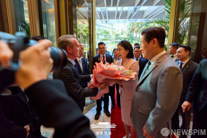 [서울=뉴스핌] 김혜경 여사가 지난 26일(현지 시간) 말레이시아 쿠알라룸푸르의 숙소에 들어서며 관계자에게 꽃다발을 받고 있다. [사진=대통령실] 2025.10.27 photo@newspim.com