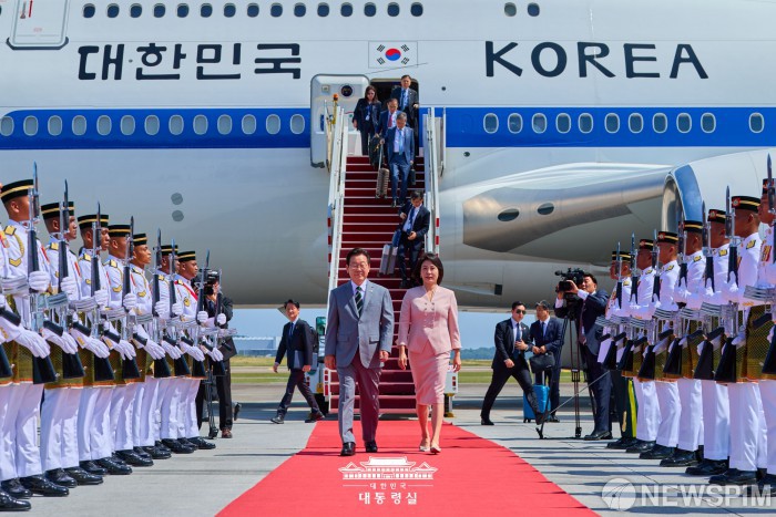 [서울=뉴스핌] 이재명 대통령과 김혜경 여사가 지난 26일(현지 시간) 말레이시아 쿠알라룸푸르 국제공항에 도착하고 있다. [사진=대통령실] 2025.10.27 photo@newspim.com