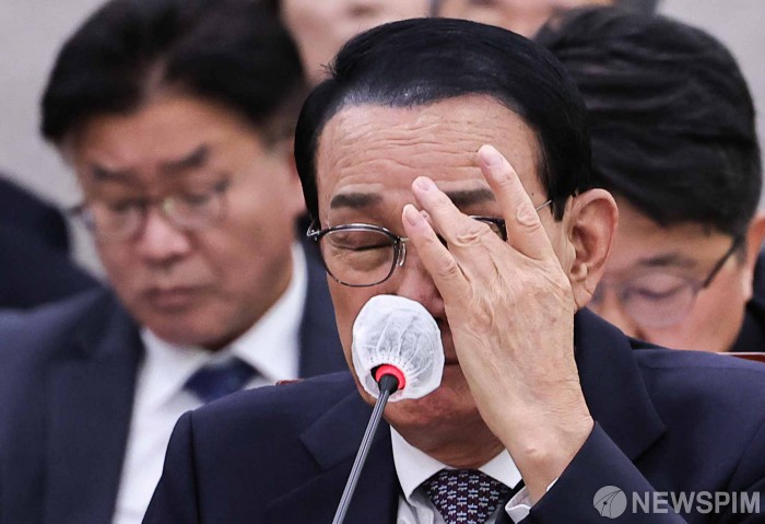 [서울=뉴스핌] 윤창빈 기자 = 노동진 수산업협동조합중앙회장이 27일 서울 여의도 국회에서 열린 농림축산식품해양수산위원회의 수협중앙회 등에 대한 국정감사에서 안경을 고쳐쓰고 있다. 2025.10.27 pangbin@newspim.com