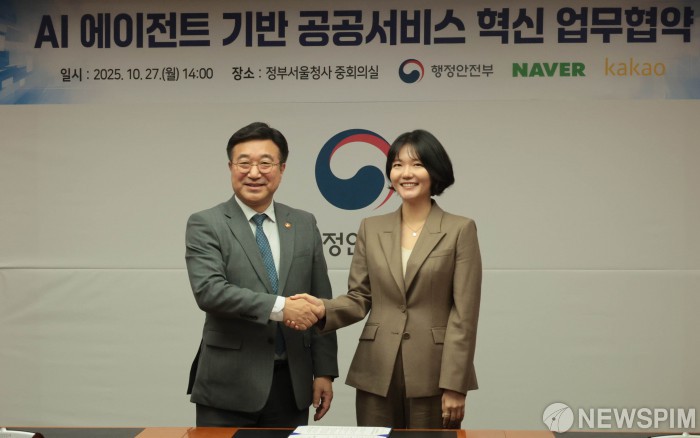 [서울=뉴스핌] 이길동 기자 = 윤호중 행정안전부 장관이 27일 서울 종로구 정부서울청사에서 열린 AI 에이전트 기반 공공서비스 혁신 업무협약식에서 협약서 서명후 최수연 네이버 대표와 악수하며 기념촬영하고 있다. 2025.10.27gdlee@newspim.com
