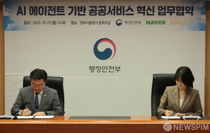 [서울=뉴스핌] 이길동 기자 = 윤호중 행정안전부 장관과 네이버 최수연 대표가 27일 서울 종로구 정부서울청사에서 열린 AI 에이전트 기반 공공서비스 혁신 업무협약식에서 협약서에 서명하고 있다. 2025.10.27gdlee@newspim.com