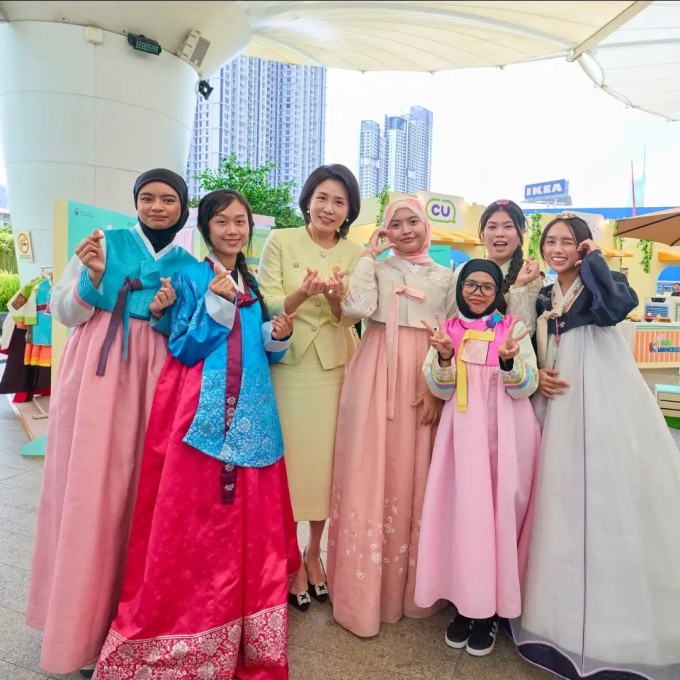 김혜경 여사가 27일(현지시간) 말레이시아 쿠알라룸푸르에서 열린 '2025 K-Fresh Food Universe Malaysia' 행사장에서 한복을 입은 현지 관람객들을 맞으며 고마움을 전하고 기념사진을 찍고 있다. [사진=KTV]