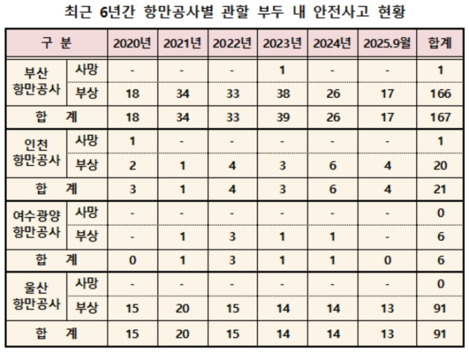 [2025 국감] 6년간 항만공사 안전사고 285건…부산항만공사 167건 '최다'