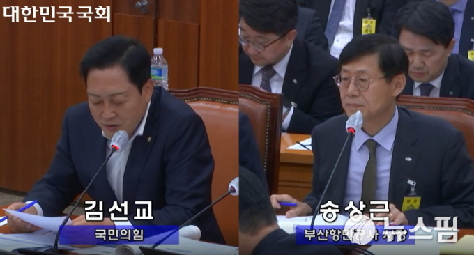 송상근 부산항만공사 사장(오른쪽)이 27일 국회 농림축산식품해양수산위원회 국정감사에서 김선교 국민의힘 의원 질의에 답하고 있다. [사진=국회 의사중계시스템] 2025.10.27 dream@newspim.com