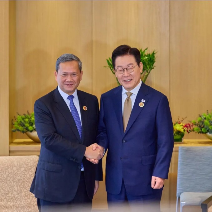 | 이재명 대통령이 27일(현지시간) 오전 말레이시아 쿠알라룸푸르에서 훈 마네트 캄보디아 총리와 정상회담에서 악수하고 있다. [사진=KTV] |