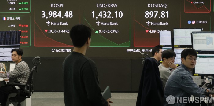 [서울=뉴스핌] 양윤모 기자 = 28일 오전 코스피가 전장 종가보다 58.35 포인트(1.44%) 하락하며 3984.48로, 코스닥은 4.89 포인트(0.54%) 하락한 897.81로 장을 시작한 가운데, 서울 중구 하나은행 딜링룸에서 직원들이 업무를 보고 있다. 서울외환시장에서 달러/원 환율은 전장 대비 0.40원 상승한 1432.10원에 거래를 시작했다. 2025.10.28 yym58@newspim.com