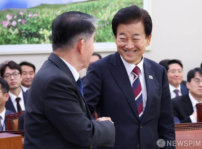 [서울=뉴스핌] 정일구 기자 = 정동영 통일부 장관이 28일 오전 서울 여의도 국회 외교통일위원회에서 열린 외교부·통일부 등에 대한 종합감사에서 김경협 재외동포청장과 인사를 나누고 있다. 2025.10.28 mironj19@newspim.com