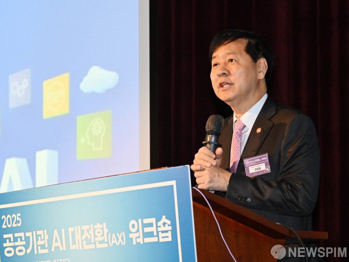 [서울=뉴스핌] 구윤철 부총리 겸 기획재정부 장관이 28일 서울 마포구 누리꿈스퀘어에서 열린 '2025 공공기관 AI 대전환 워크숍'에서 개회사를 하고 있다. [사진=기획재정부] 2025.10.28 photo@newspim.com