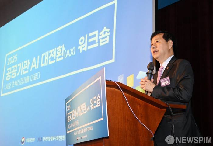 [서울=뉴스핌] 구윤철 부총리 겸 기획재정부 장관이 28일 서울 마포구 누리꿈스퀘어에서 열린 '2025 공공기관 AI 대전환 워크숍'에서 개회사를 하고 있다. [사진=기획재정부] 2025.10.28 photo@newspim.com