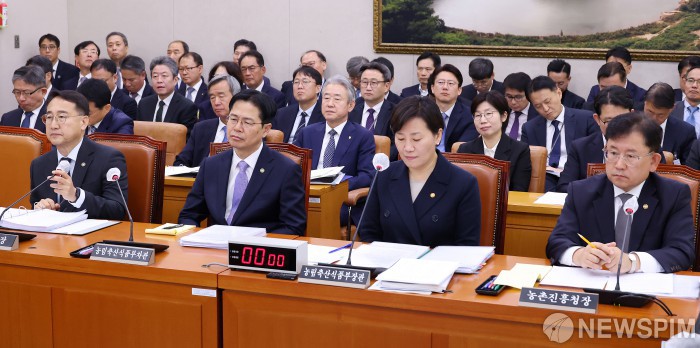 [서울=뉴스핌] 정일구 기자 = 김인호 산림청장(왼쪽부터), 강형석 농림축산식품부 차관, 송미령 장관, 이승돈 농촌진흥청장이 28일 서울 여의도 국회 농림축산식품해양수산위원회에서 열린 농림축산식품부 등에 대한 종합감사에 출석해 있다. 2025.10.28 mironj19@newspim.com