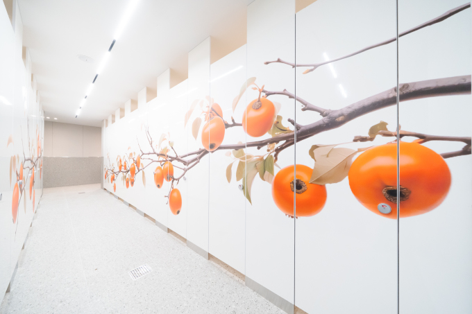 내부는 감나무 프린팅이 적용된 깨끗한 흰색 문과, 노크 없이 사용 여부를 확인할 수 있는 잠금장치, 어린이 전용 화장실 등 모든 연령과 성별을 고려한 고객 맞춤형 편의시설을 갖추었다.