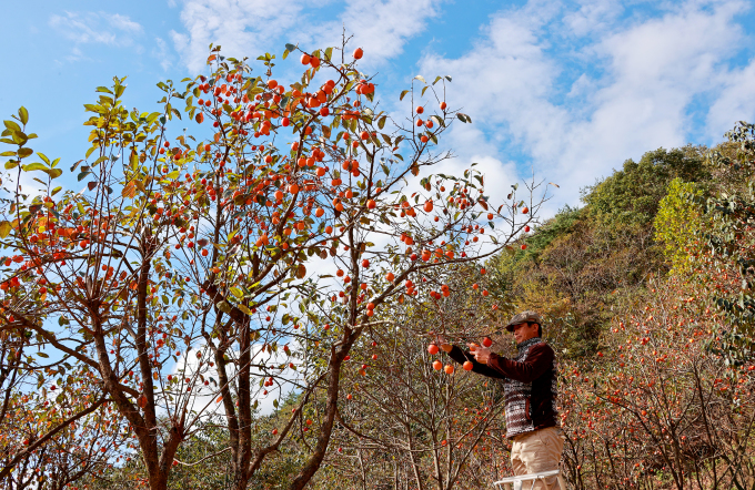 [괴산=뉴스핌] 백운학 기자 = 28일 충북 괴산군 연풍면의 감밭은 가을 햇살에 반짝이는 주홍빛 감들로 가득하다.