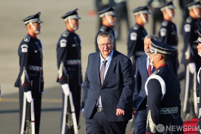[서울=뉴스핌] 알렉세이 오베르추크 러시아 국제문제 담당 부총리가 29일 2025년 APEC 정상회의에 참석하기 위해 부산 김해공항에 도착하고 있다. [사진=APEC 2025 KOREA & 연합뉴스] 2025.10.29 photo@newspim.com
