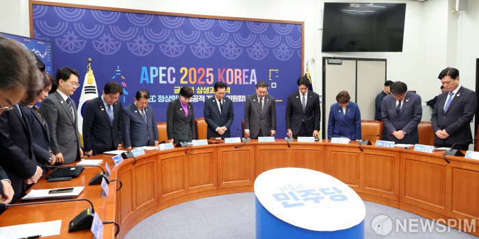 [서울=뉴스핌] 정일구 기자 = 정청래 더불어민주당 대표와 김병기 원내대표를 비롯한 지도부가 29일 오전 서울 여의도 국회에서 열린 최고위원회의에 앞서 10.29 이태원 참사 희생자를 추모하는 묵념을 하고 있다. 2025.10.29 mironj19@newspim.com
