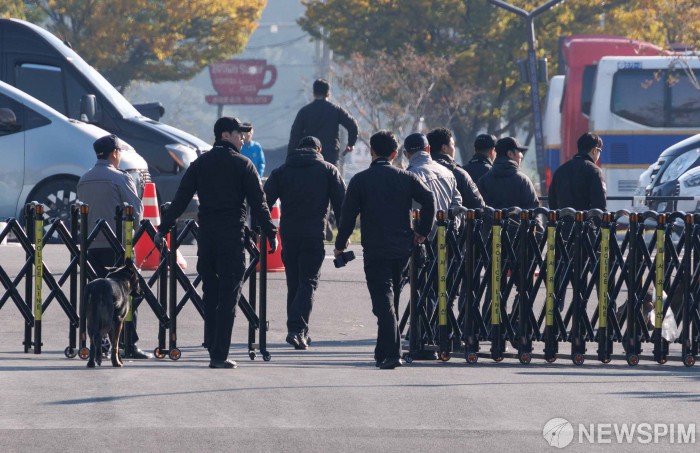 [경주=뉴스핌] 윤창빈 기자 = 29일 한미정상회담이 열리는 경북 경주시 국립경주박물관에서 경호 인력들이 행사장을 점검하고 있다. 2025.10.29 pangbin@newspim.com