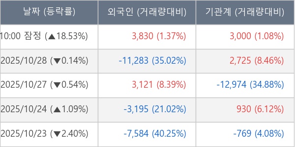 [서울=뉴스핌] 로보뉴스 = 29일 10시 15분 현재 자람테크놀로지(389020)는 외국인과 기관이 각각 0.38 만 주, 0.30 만 주 순매수(잠정) 하면서 전일 대비 18.53% (현재가 43,500원) 상승하고 있다.
